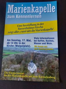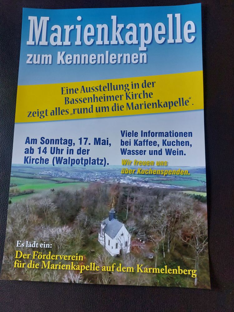 Das traditionelle Grillen auf dem Karmelenberg am Himmelfahrtstag fällt dieses Jahr aus! Stattdessen kommt am Sonntag, 17. Mai die Marienkapelle quasi in die Bassenheimer Pfarrkirche. Der `Förderverein für die Marienkapelle auf dem Karmelenberg´ zeigt dort in einer umfangreichen Ausstellung Details und informiert über das barocke Gebäude auf dem 372 m hohen Karmelenberg. Bei Kaffee und Kuchen oder einem Glas Wein können sich ab 14 Uhr die Besucherinnen und Besucher informieren, was der Förderverein seit über 30 Jahren aktiv zum Erhalt der kleinen Waldkirche beiträgt. So soll die Ausstellung mitten im Ort vielen Interessierten die Marienkapelle näherbringen, ohne dass sie den etwas beschwerlichen Weg hinauf zum Karmelenberg gehen müssen.